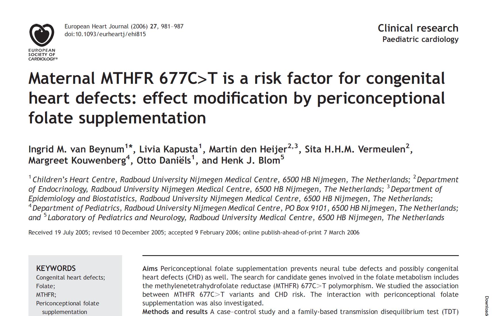 1. van der Put NM, Steegers-Theunissen RP, Lindemans J, et al. Maternal MTHFR 677C>T er en risikofaktor for medfødt hjertefejl: effektmodifikation ved perikonceptionelt folattilskud. Eur Heart J. 2006.
