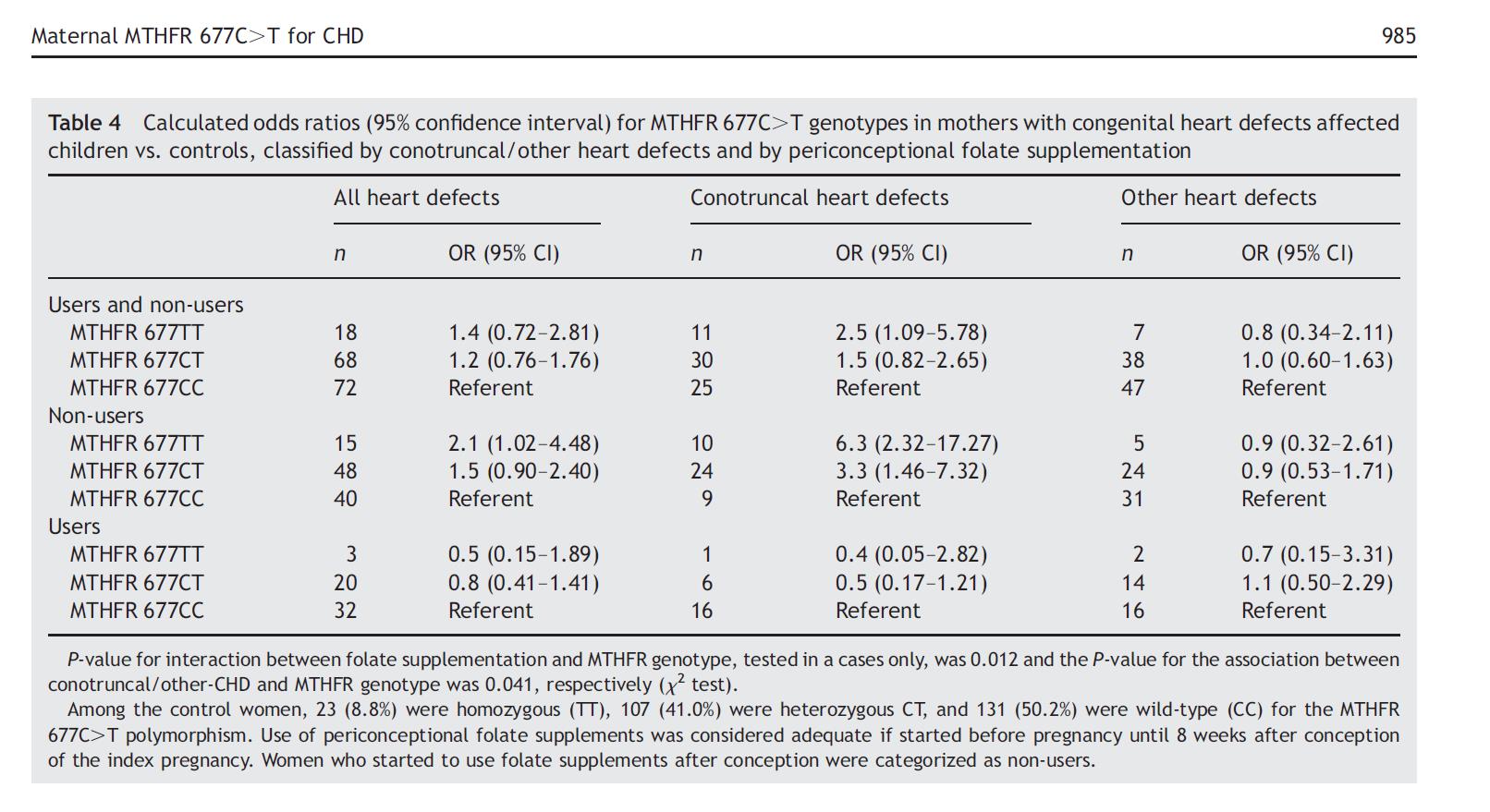 Blandt 165 familier med medfødt hjertesygdom (CHD) og 220 kontrolfamilier, mødre, der bar MTHFR 677 CT eller TT genotype og IKKE havde taget perikonceptionelle folattilskud var langt mere tilbøjelige til at få et barn med hjertefejl af ledningstypen (OR 3,3 og 6.3).