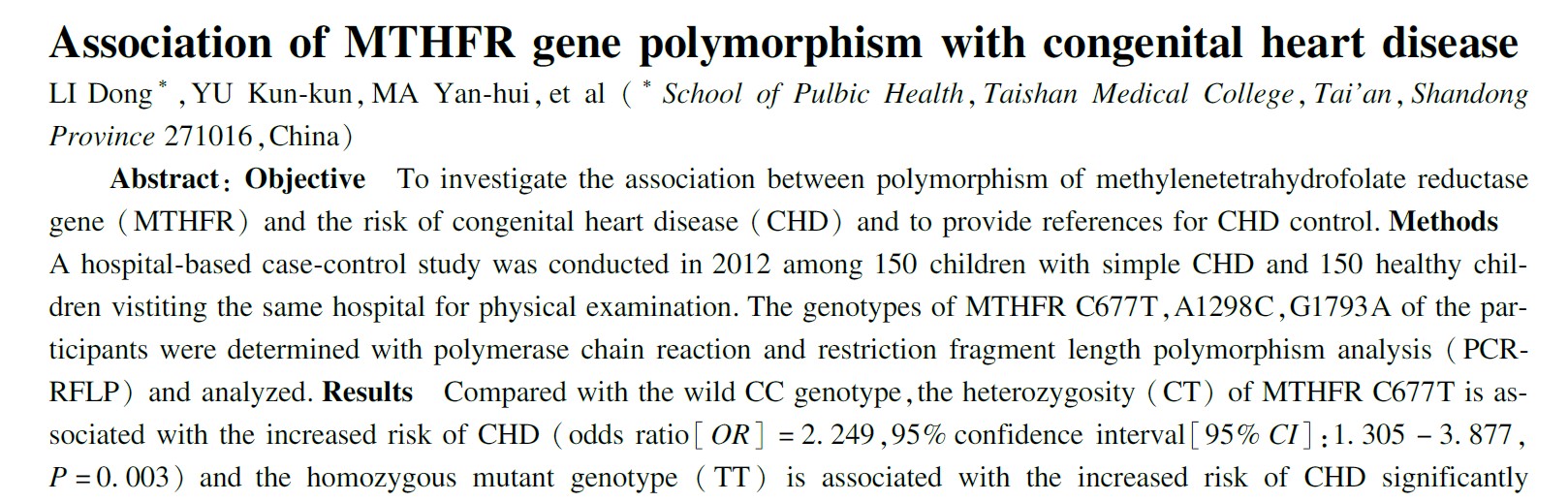 En undersøgelse fra Qilu Children's Hospital i Shandong Universitetet viste, at T-allelen af MTHFR C677T øger CHD odds 1,8 gange; TT- og CT-genotyper skubber risikoen til 3,1-fold og 2,2-fold.