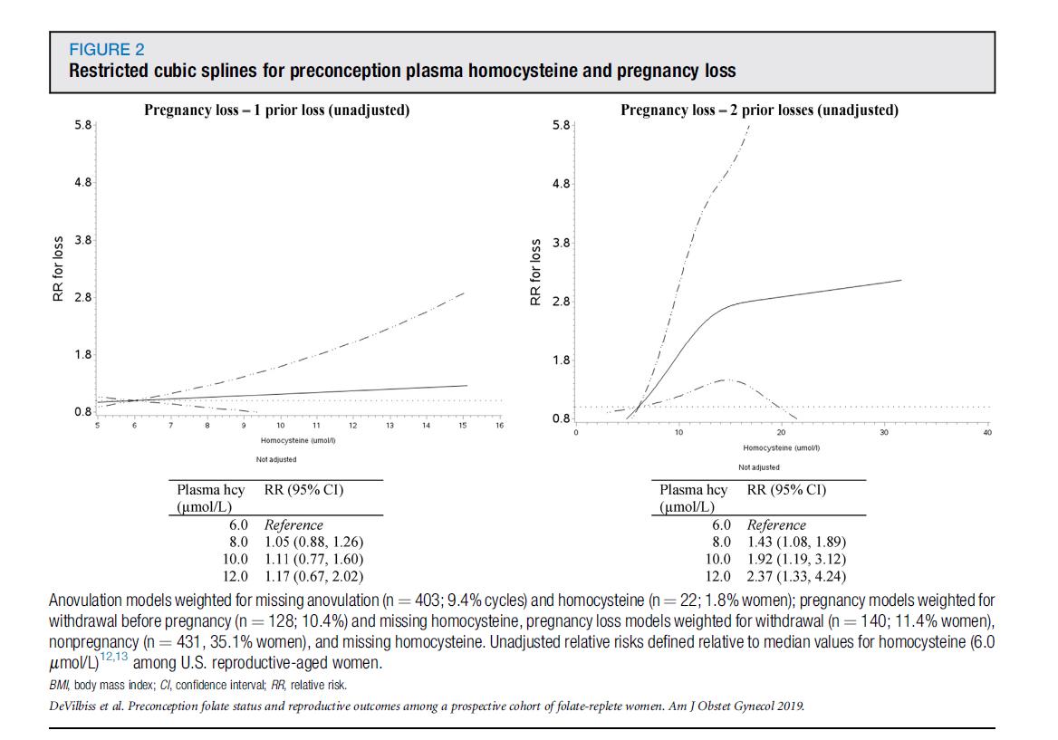 · En klar dosisafhængig sammenhængmed homocystein (Hcy): blandt kvinder med to tidligere tab, hver 2µmol/L stigning i Hcy (f.eks. fra 6 µmol/L til 8 µmol/L) var forbundet med en43% stigning i abortrisiko.