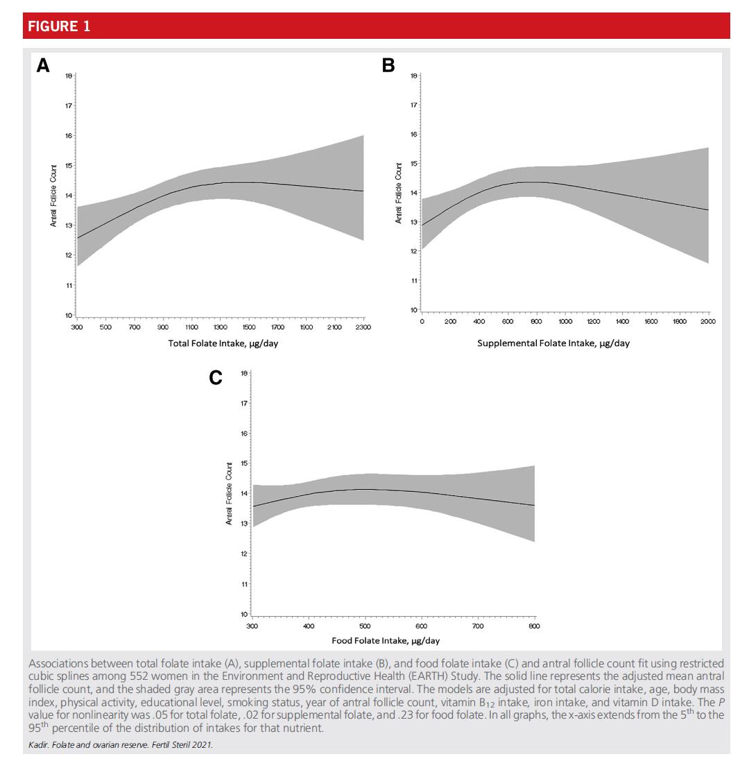 Dataene indikerede, at den positive sammenhæng mellem totalt folinsyreindtag og AFC når et plateau på ca1200 mikrogram om dagen. Den største fordel ved folinsyreindtag fra kosttilskud (Folsyre, syntetisk folinsyre) forekommer ca800 mikrogram om dagen. Sammenlignet med kvinder med en daglig indtag af 400 mikrogram folinsyre, dem der indtager 800 mikrogram pr. forventes at få en stigning på ca1,5 follikler.