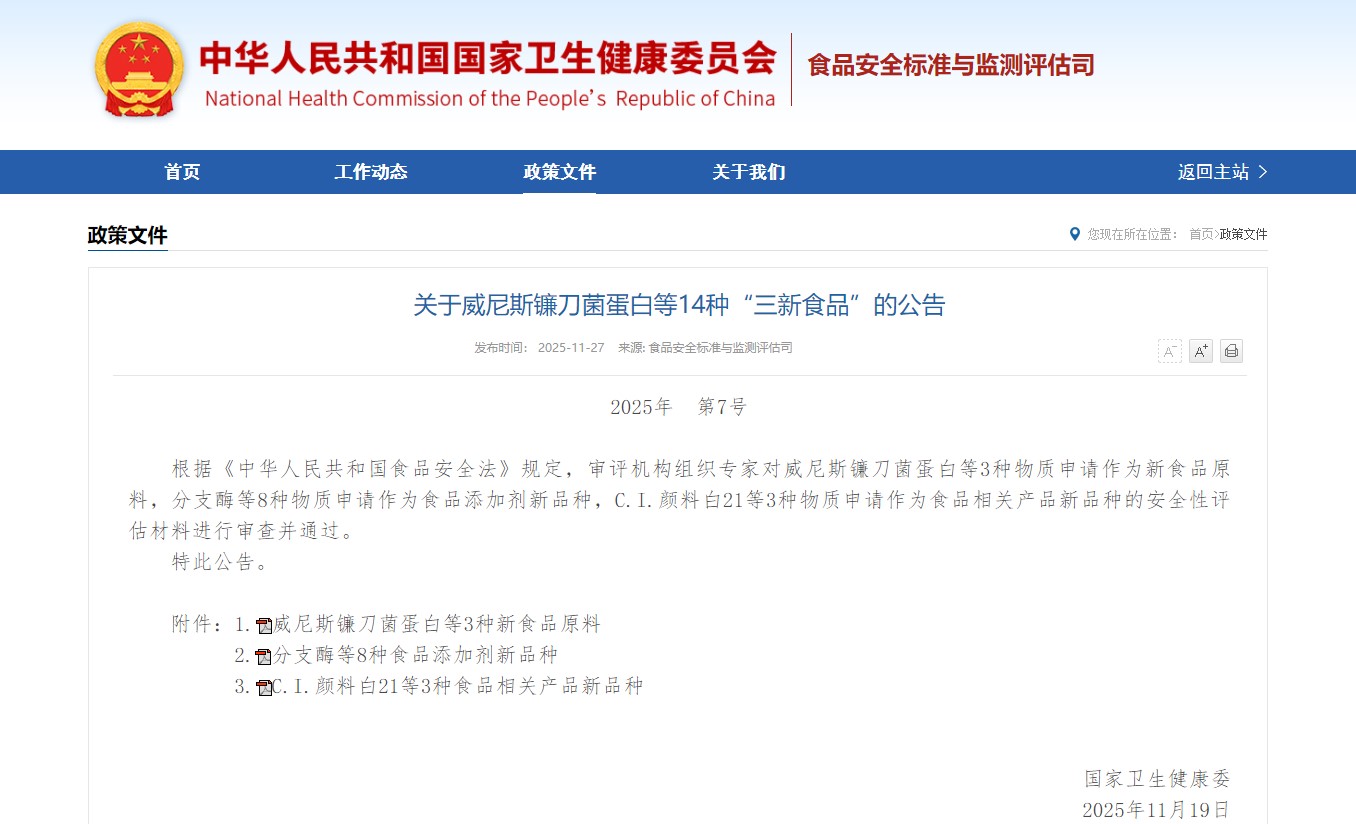 [1] Folkerepublikken Kinas nationale sundhedskommission.Meddelelse på 14 "Tre nye fødevarer" inklusive venetiansk fusariumprotein (2025, nr. 7).