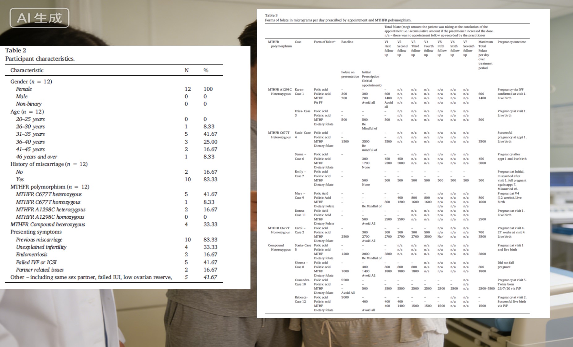 Undersøgelsen omfattede 12 patienter, hvoraf 83,3% havde en anamnese med abort og 41,7 % havde oplevet mislykkede assisterede reproduktionscyklusser. Alle var diagnosticeret med MTHFR-genpolymorfi (oftest heterozygot C677T, heterozygot forbindelse osv.). For disse kvinder, hver negativ graviditetstest var mere end blot et tal – det repræsenterede følelsesmæssig og fysisk udmattelse. Det hastede med at finde en virkelig passende ernæringsplan.