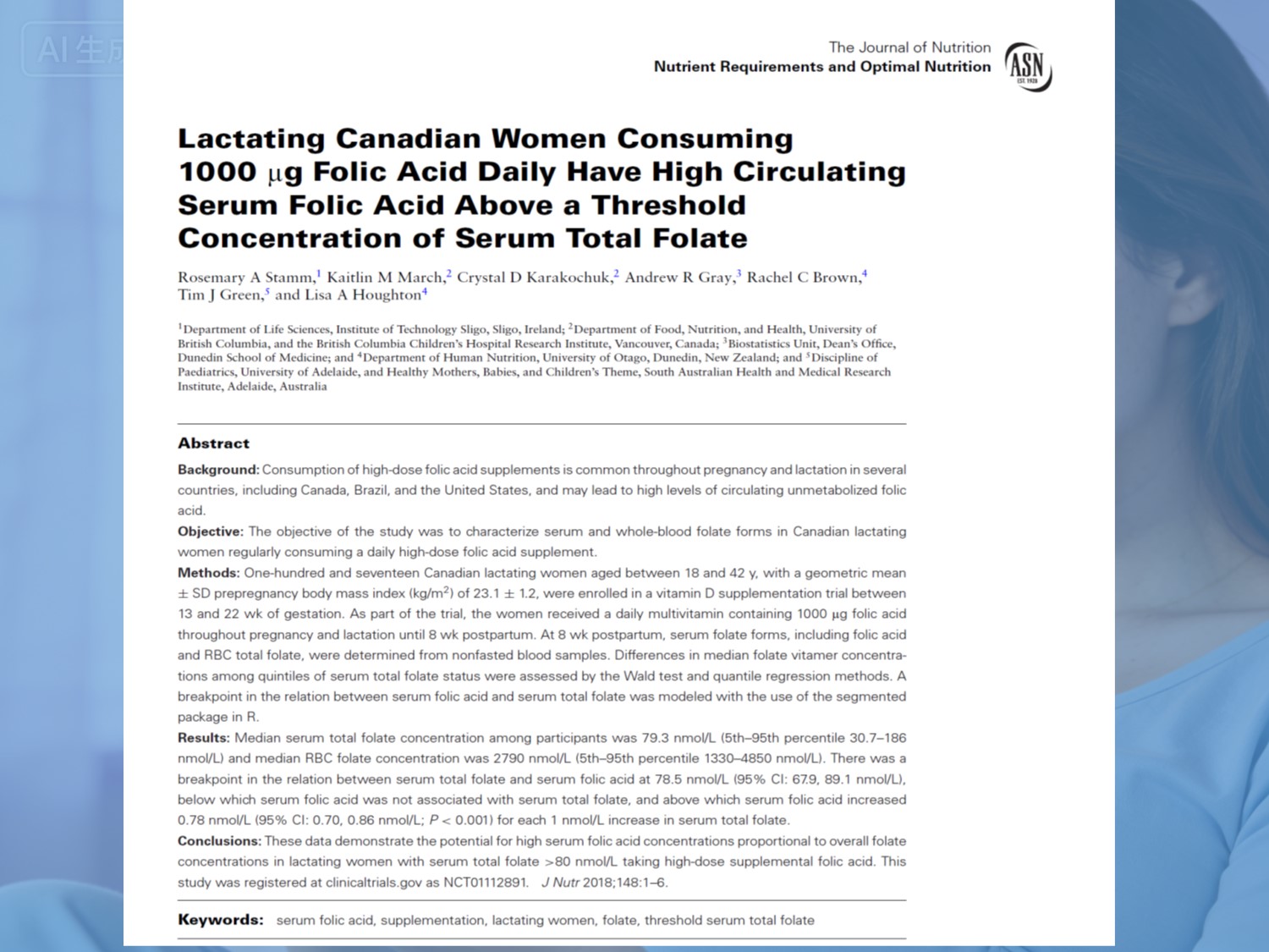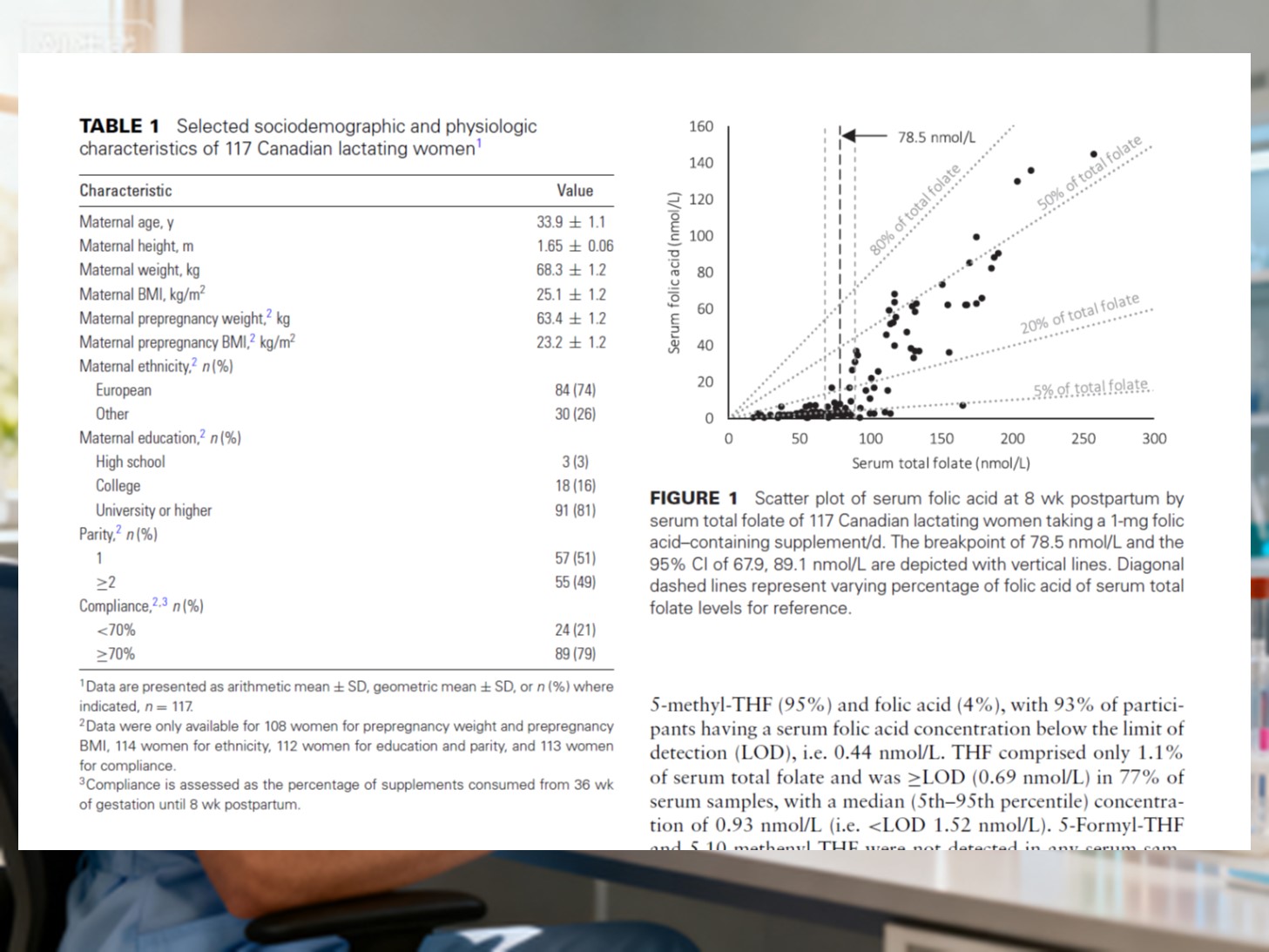 Undersøgelsen omfattede 117 raske ammende kvinder. Fra midt i graviditeten videre tog de 1000 μg folinsyre plus 12 μg vitamin B₁₂dagligt, indtil 8 uger efter fødslen. Blodprøver indsamlet 8 uger efter fødslen blev analyseret for folatformer.